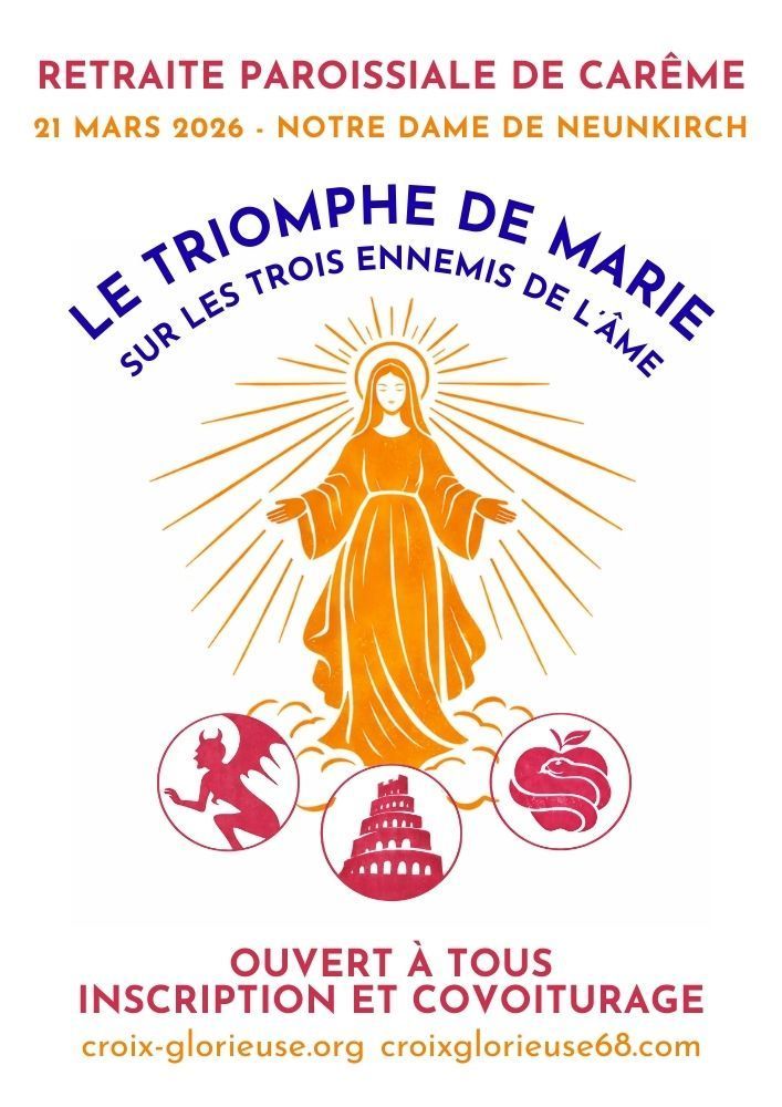 Programme 9h : Arrivée au sanctuaire Notre-Dame de Neunkirch (5 Rue Notre Dame, 67860 Friesenheim) 9h30 : 1er enseignement 10h30 : Chapelet 11h15 : Messe 12h30 : déjeuner (amenez votre pique-nique) 14h30 : 2ème enseignement 15h30 : adoration et confessions 16h30 : 3ème enseignement 18h : fin de la récollection Prise en charge des enfants Pour les enfants jusqu’à la Moyenne Section incluse, les enfants sont forcément à la garderie. Une équipe de baby-sitters s’occupe des enfants. Ils sont pris en charge tout le temps sauf au moment du repas. Apportez un lit pliant pour la sieste. Les enfants à partir de la Grande Section sont intégralement pris en charge pendant la récollection, sauf pendant le repas. Des prédications adaptées leur sont données par les abbés. Les lycéens participent aux enseignements des adultes.